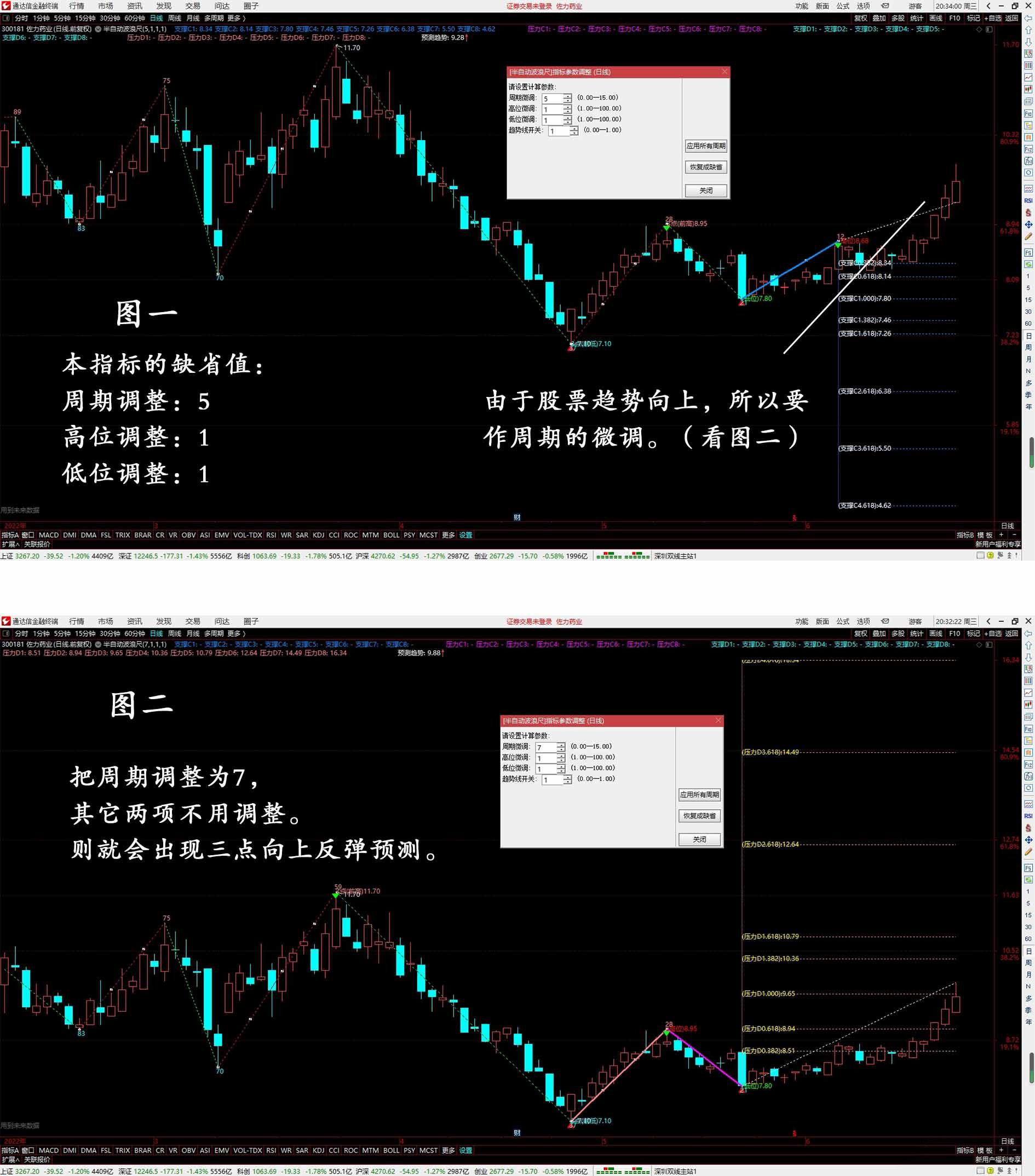 指标用法与我以前编的其它自动预测的指标一样,指标上有说明。指标命名为半自动,只是说明有些股在缺省(默认)的参数值(5、1、1)时,不一定在合理的预测点,要适当进行小量的参数微调,在参数调整窗,除了有周期微调,增加了高位微调、低位微调两栏,是为了方便扩充周期微调的范围。一般情况下不用微调这两栏。(如果预测调整乱了,参数恢复5、1、1后重新调整就可以),详细参看图例。