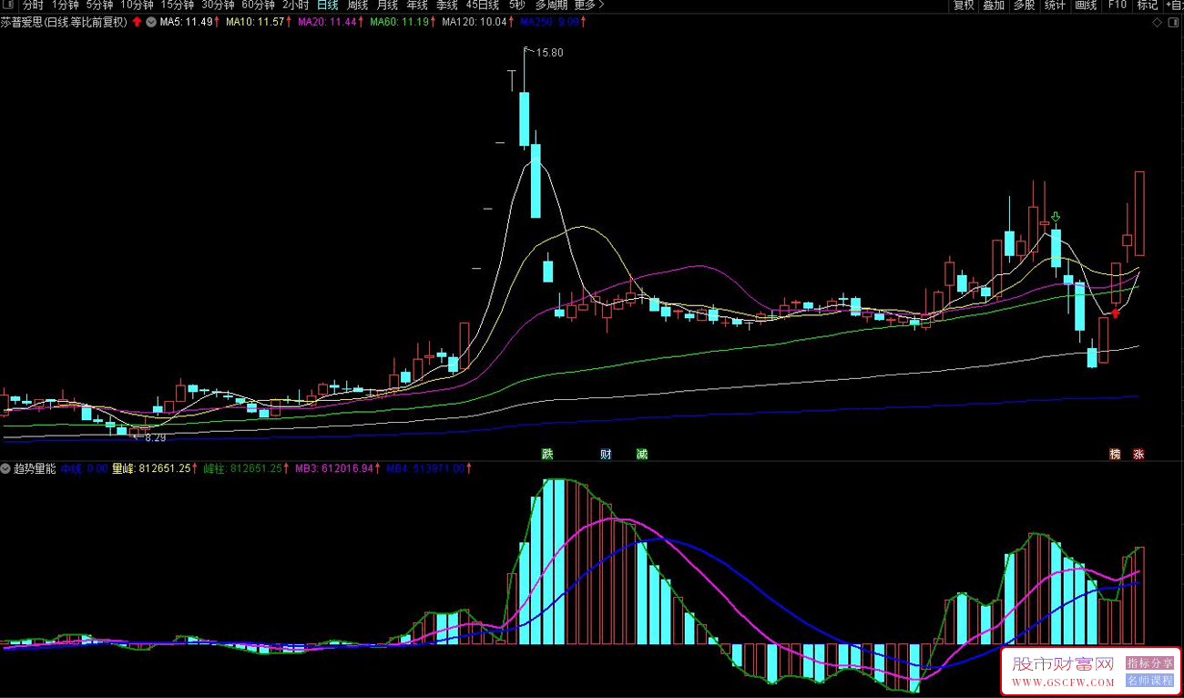 1、这是以量能函数编写的一个改量技术指标,相比系统自带的成交量指标,该指标更能明确和清楚的指标量能的大小和运行趋势。