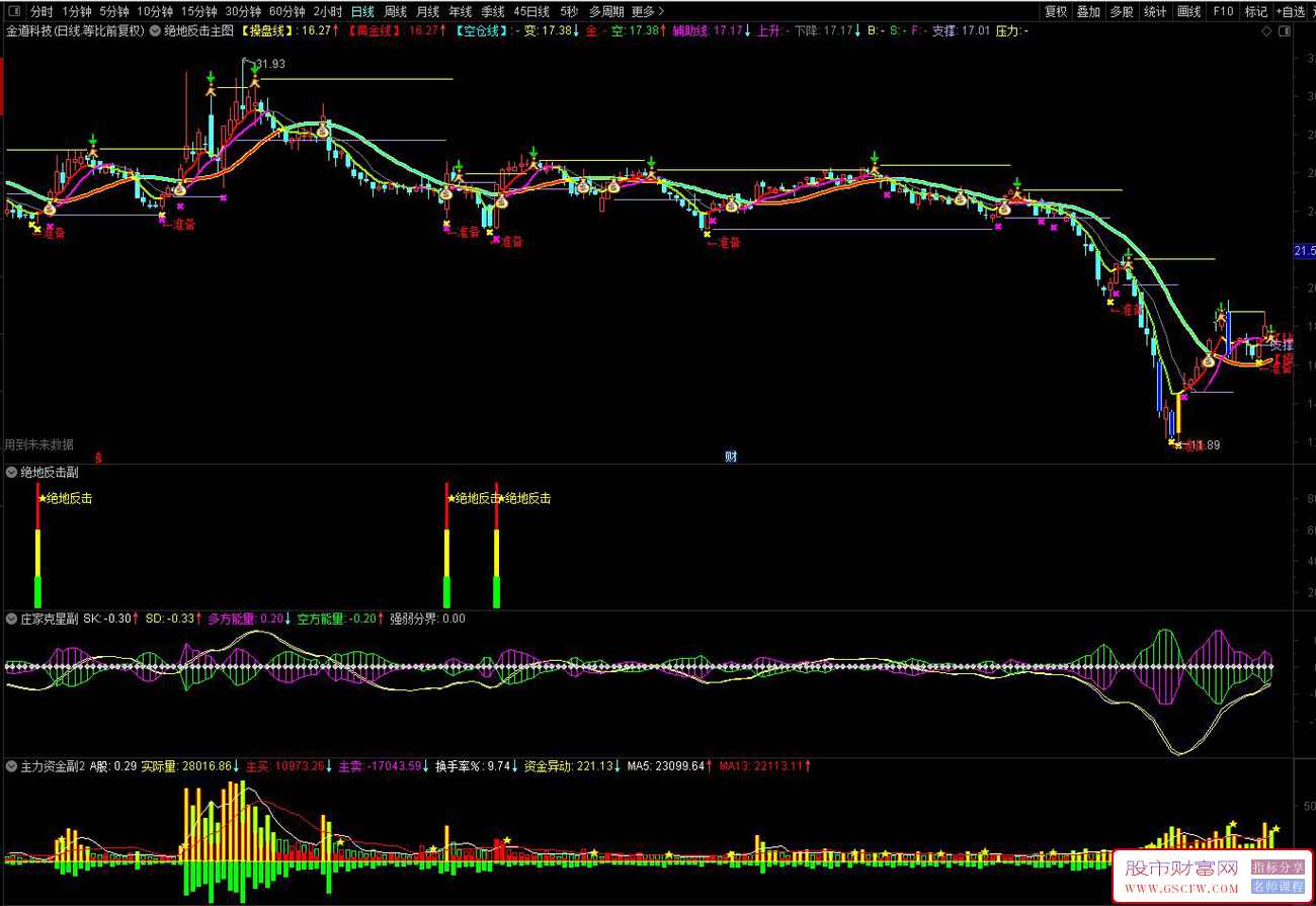 具体用法,各位请多看看庄家克星副图指标吧。因绝地反击的副图出票较少,所以不会常出信号。大家多研究吧。