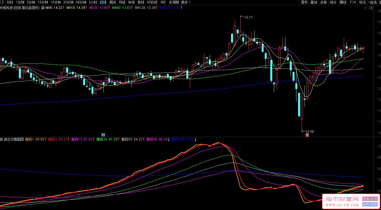 3、使用时,每一条短周期的筹码线上穿长周期的筹码线,均是筹码收集的过程,上穿角度越大,筹码收集越快,表明有强庄位于其中。