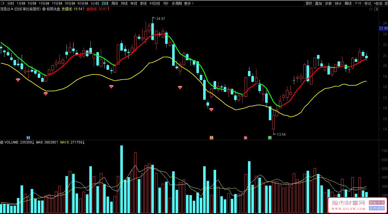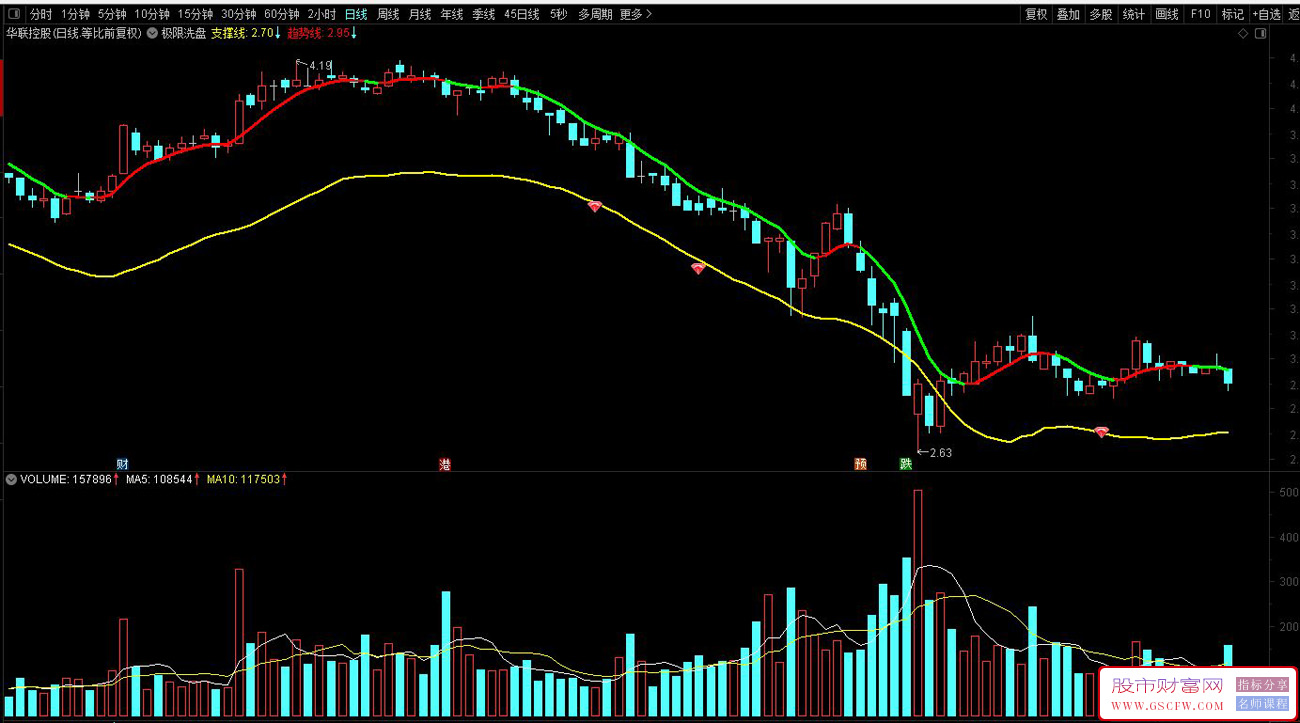 5、黄线则是支撑线,当K线跌破黄线段时,基本上就是空头行情,此时清空所有筹码,持币观望为主。