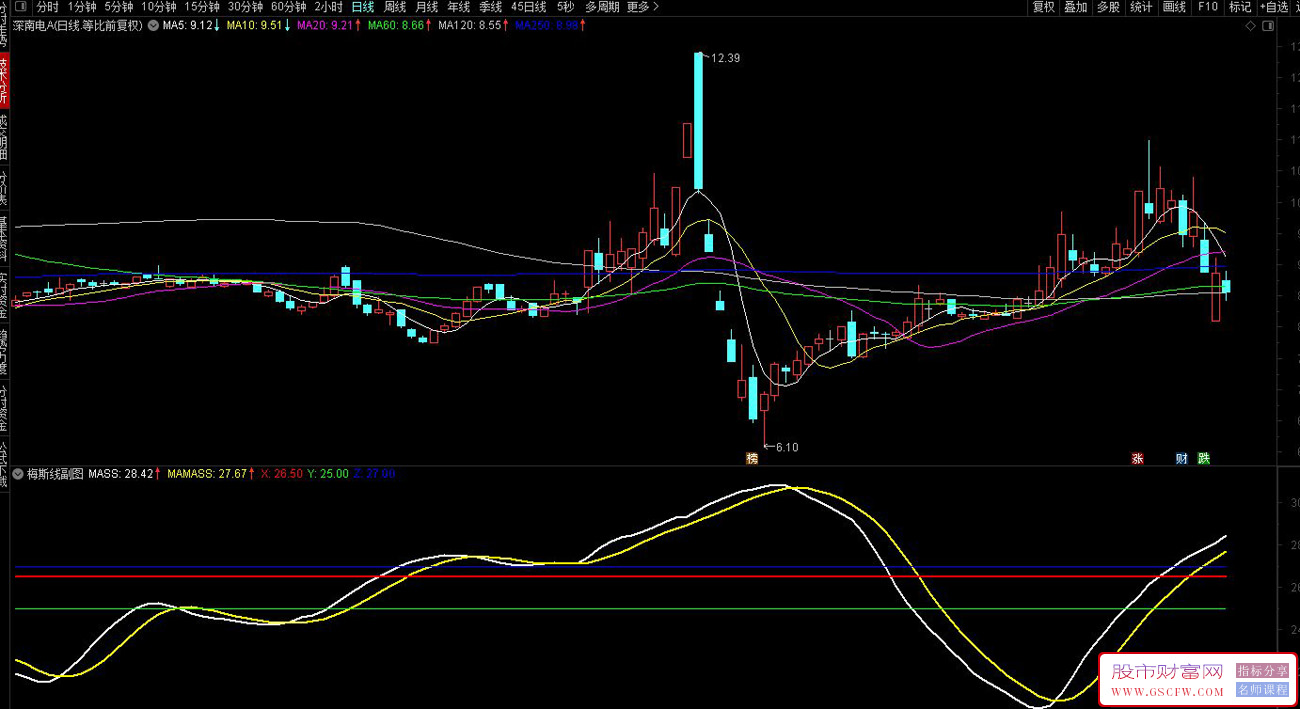 1、MASS曲线向上穿越27,随后又掉头跌落26.5。当时,如果股价的9天移动平均线,正处于上升状态,代表多头行情即将反转下跌。
