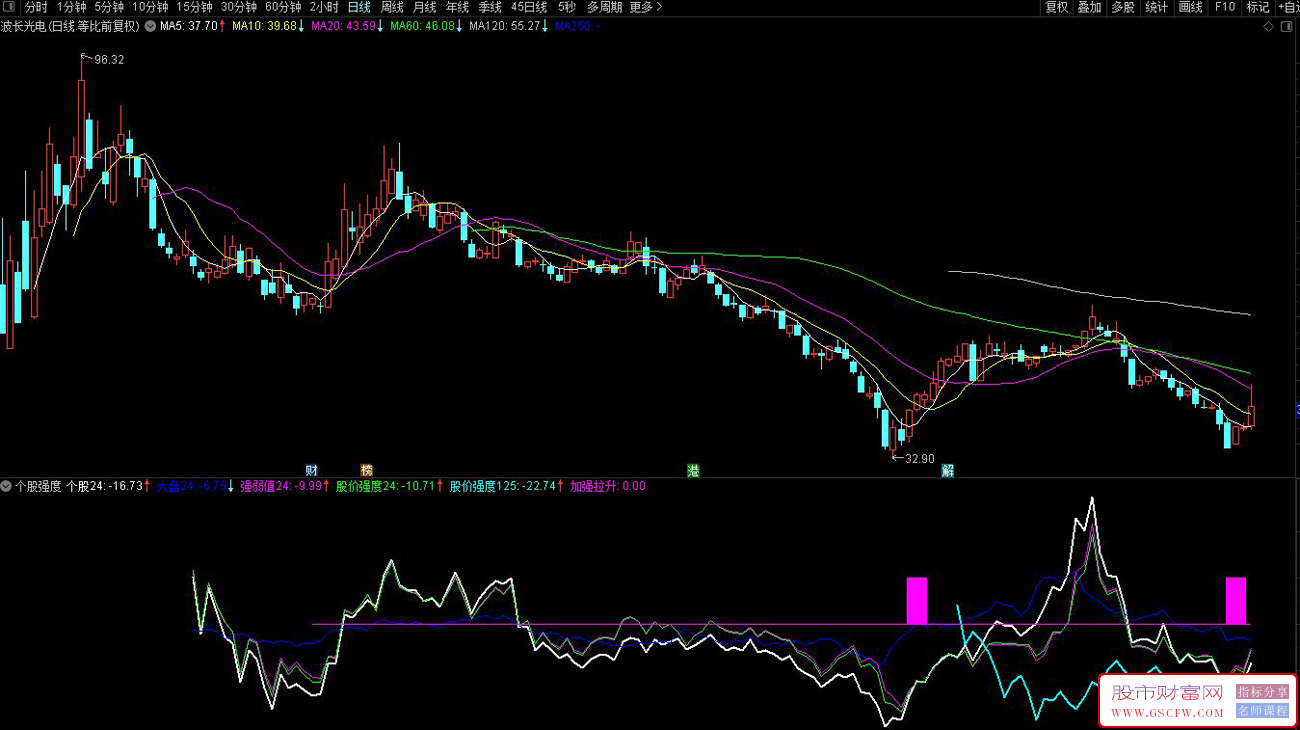 里面的白线代表的是个股强度,蓝色线代表大盘。这里面的指数我加了一套125天的数值,可以更好的对比短期与中期之间的运行关系。