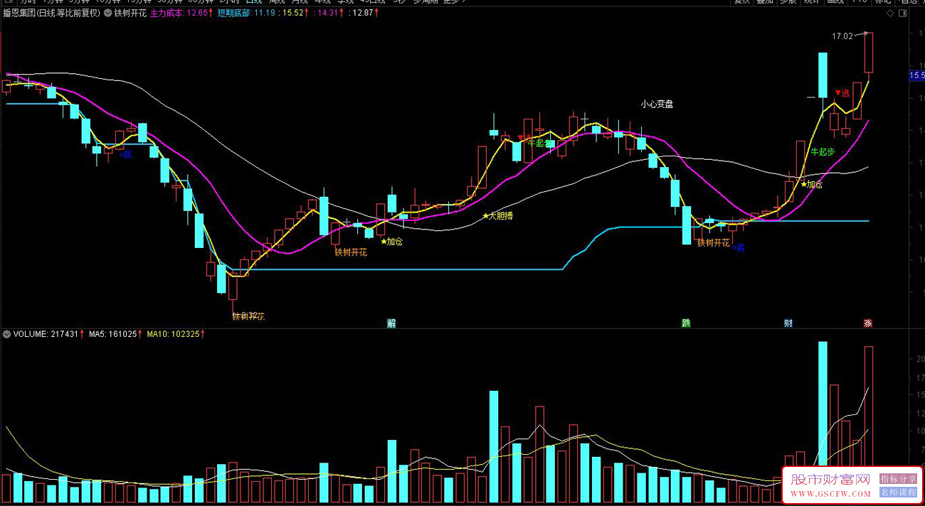 2、铁树开花:铁树开花这四个字一般不会随便显示,一旦显示了那就表示行情很容易走大涨,出现铁树开花的个股基本都是针对主力低位或者再次建仓的股票。这类型的股票并不多,但是选出来就非常经典了。