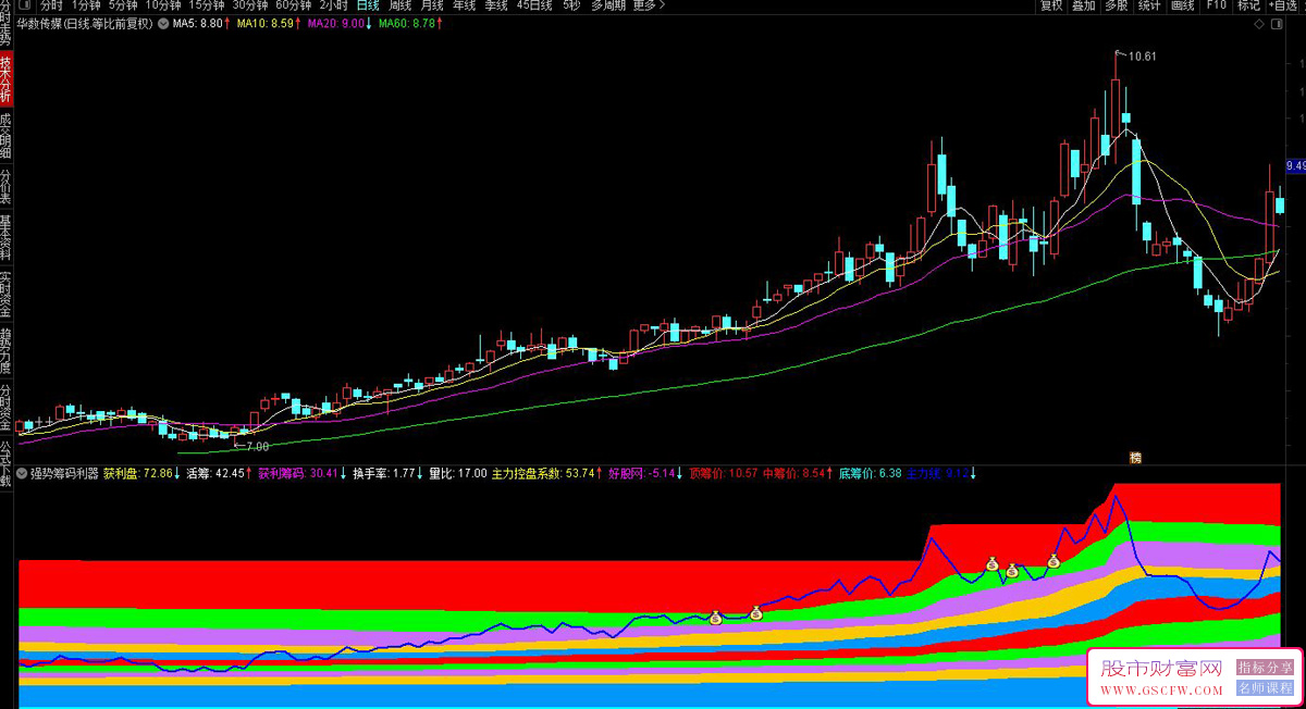指标名称:通达信【强势筹码利器】副图+选股指标 主力线进入红色筹码区域买入附图