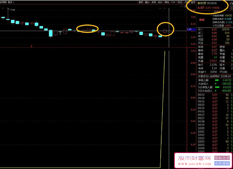 3、迅雷不及掩耳突破;这就是“弯弓”的第二弓,在调整反复中再来一个凹形,此时不破20日线,然后快速放量拉起向上,突破新高加速上涨。
