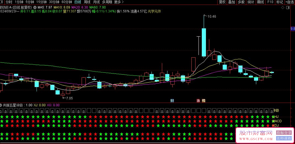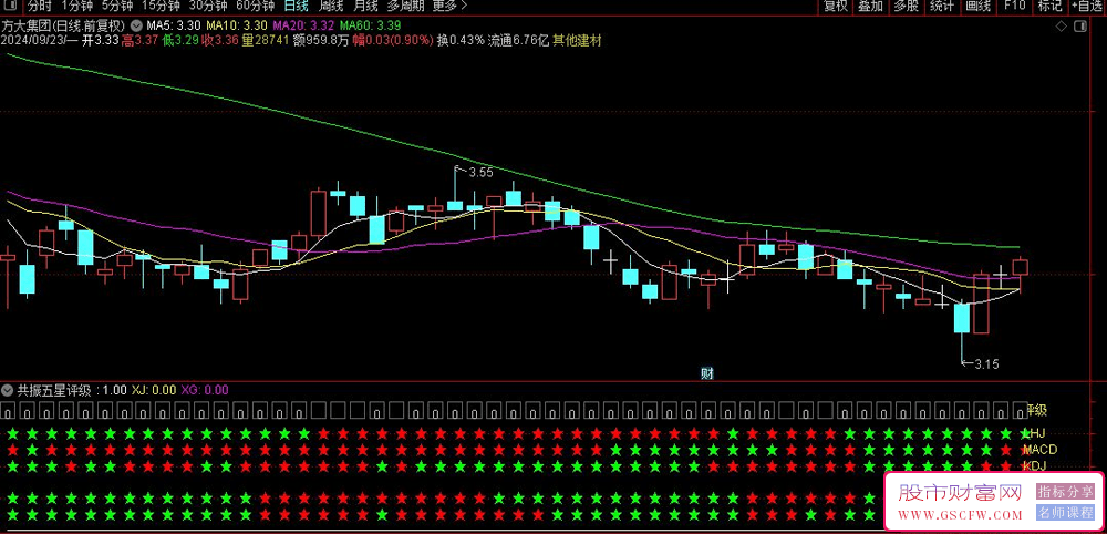 在实战操作中,五星评级副图技术指标提供了一个明确的行动指南。当市场分析达到5级或以上的评分时,意味着技术共振现象显现,为投资者指明了可能的买入时机。反之,评分低于5级的情况则提示投资者需保持观望,谨慎行动。
