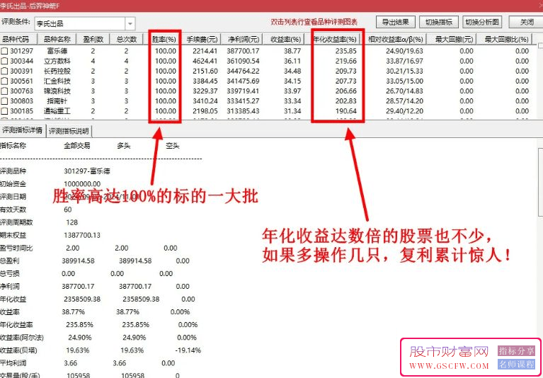 灵活的信号系统:《后羿神箭》策略提供两种买入信号——“逆转五行”与“神箭发射”,分别针对下跌趋势末期和上升趋势中的波段启动点。历史数据回测显示,全市场平均胜率接近90%,并有大量股票实现100%的胜率,以及年化数倍的收益。通过精选活跃股票,您可以在一年内累积可观的复利。