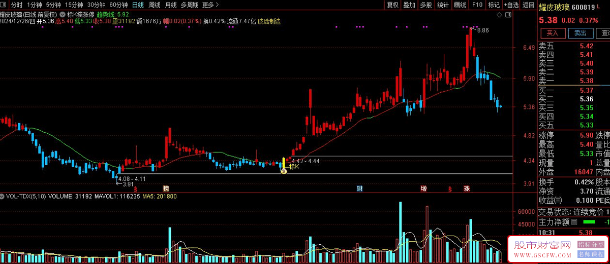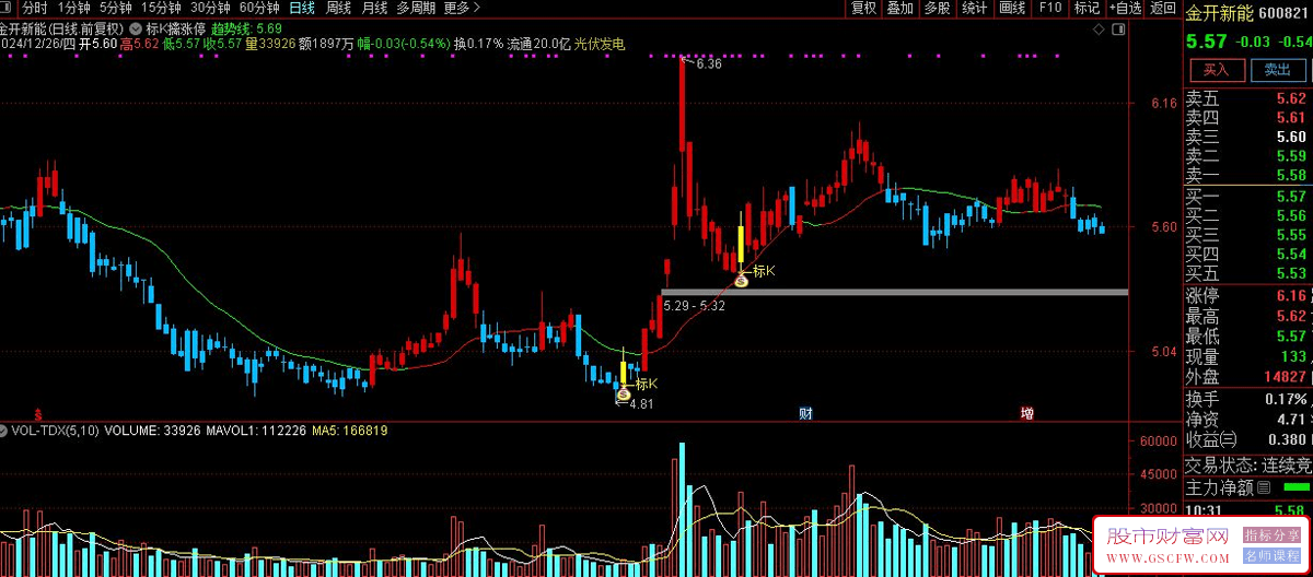 图中标k的位置会做文字标注,同时k线颜色变为黄色,k线下方标注钱袋子图标;
