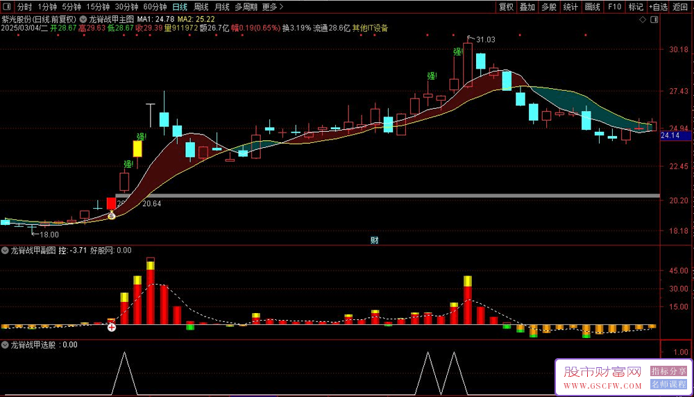 龙脊战甲】指标简介:"龙脊战甲" 寓意:如龙脊般稳健支撑,战甲般防御强势,象征主力控盘下的强势作战形态。该指标通过构建"量价共振+主力监测+趋势过滤"三维分析框架,兼顾技术分析直观性与量化交易严谨性,适合稳健型及专业交易者参考。套装指标包含:1个主图+1个副图+2个选股。