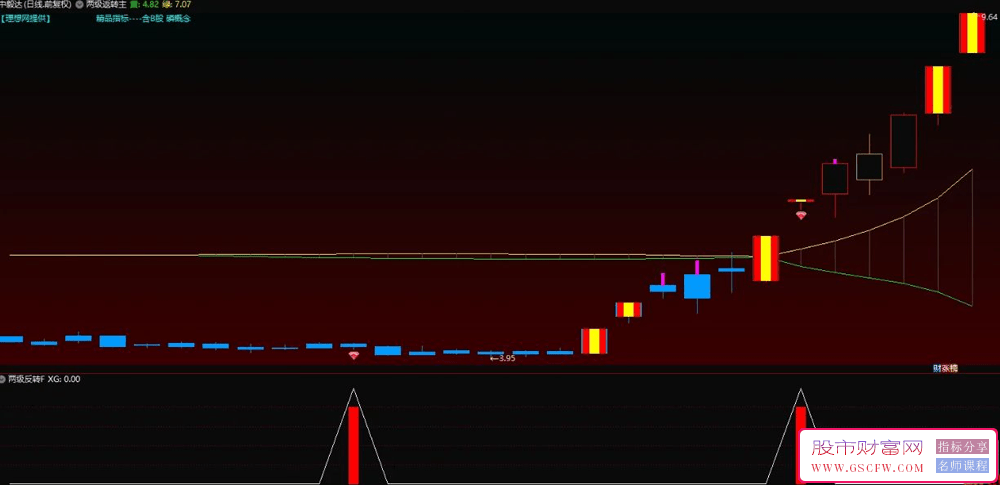 红色实体中间是黄色填充的,是涨停板的意思;