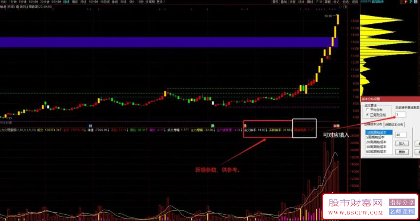 主力成交额:买比大于30显示黄色实心柱,小于则显示紫色实心柱。