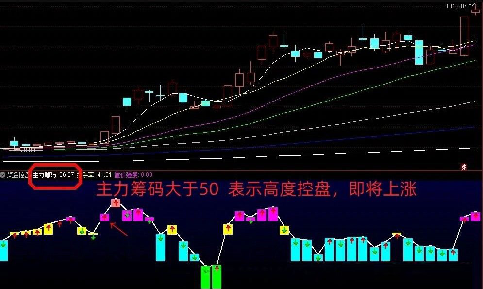 ●通过计算主力持仓筹码与波动筹码的比值,以颜色分段柱状图(红/绿等)直观展示主力控盘力度,